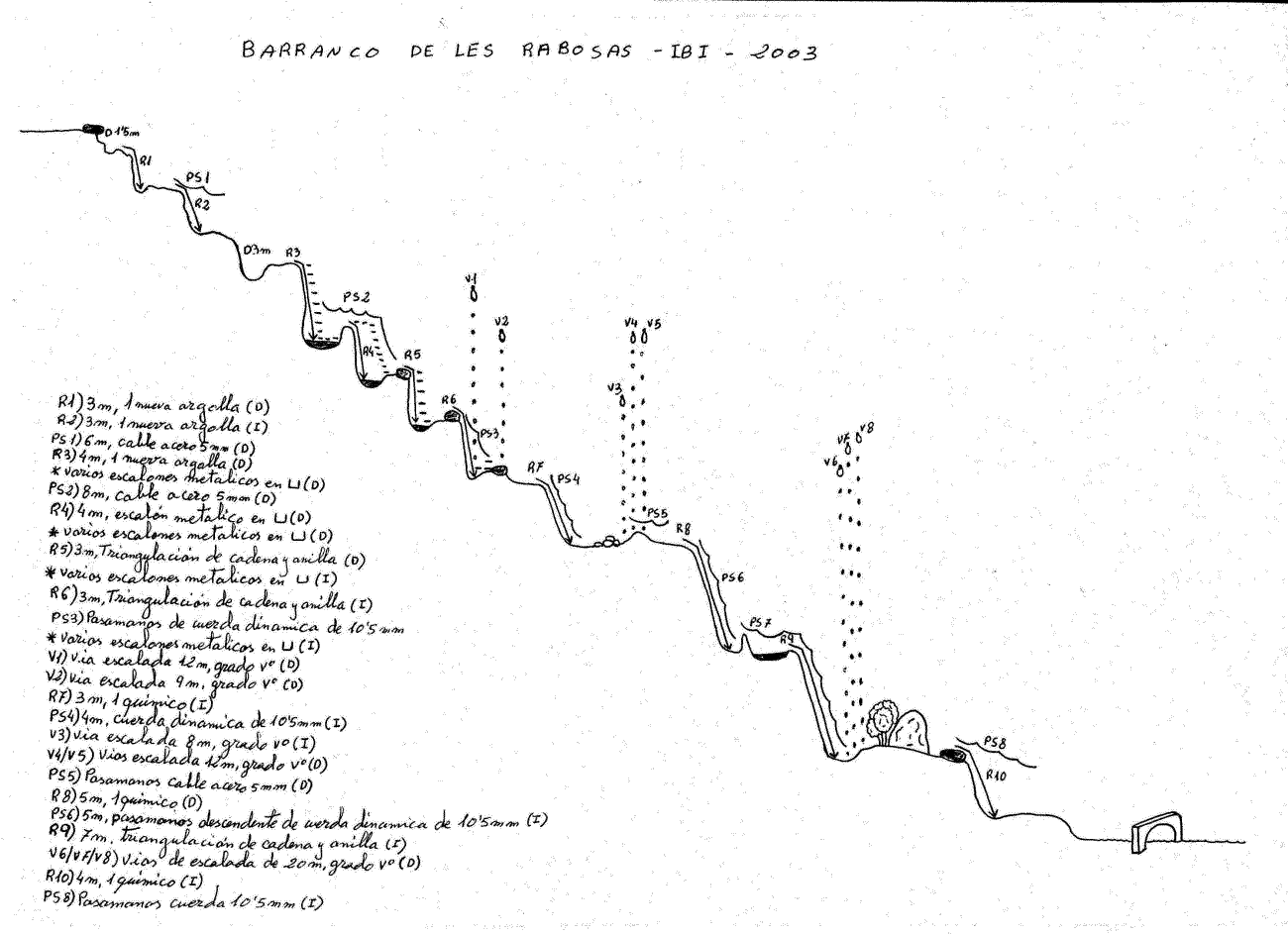 En el barranco se suceden varios destrepes en su inicio, el primer rapel es totalmente destrepable y que no lo hemos realizado, justo en el rapel 2 existe un pasamanos instalado con cable, siendo éste el verdadero inicio del descenso. Unos 20 m. nos separan de la pequeña ferrata que nos esquiva las badinas con agua y que le proporciona un gran ambiente a este barranquito. Justo en el R6 de la reseña realizaremos el primer rapel, que ya iremos en lazando con los siguientes.