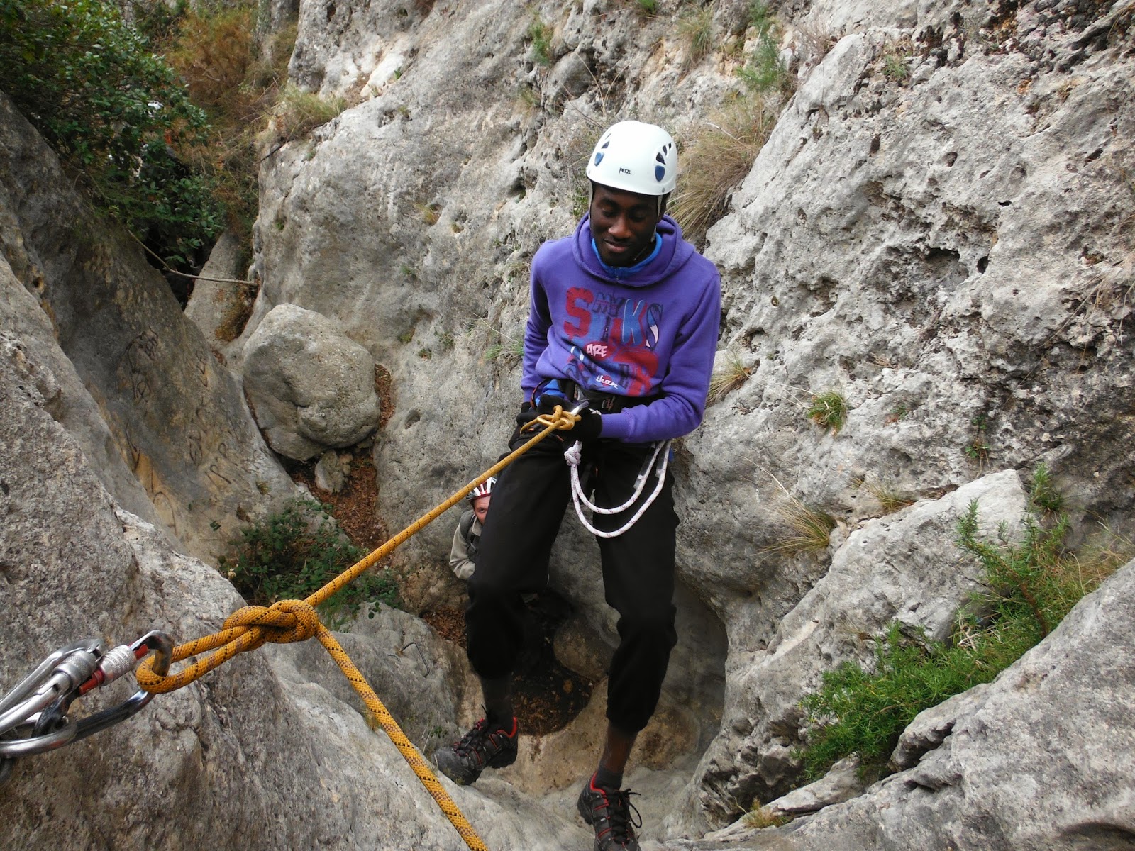 En ambos días la forma de realizar el guiado ha sido dividir el grupo de 20 alumnos en dos de 10, con el primer grupo íbamos Rafa, Ruben o Sergio, Antonio y yo instalando el barranco y enseñando a los chavales el manejo de cuerdas, los rapeles y la forma correcta de progresión. Una vez descendido el primer grupo, lo ascendemos escalando gracias a que ha sido instalado con chapas para poder subir y volvíamos a realizarlo con el segundo grupo, esta vez desinstalando.