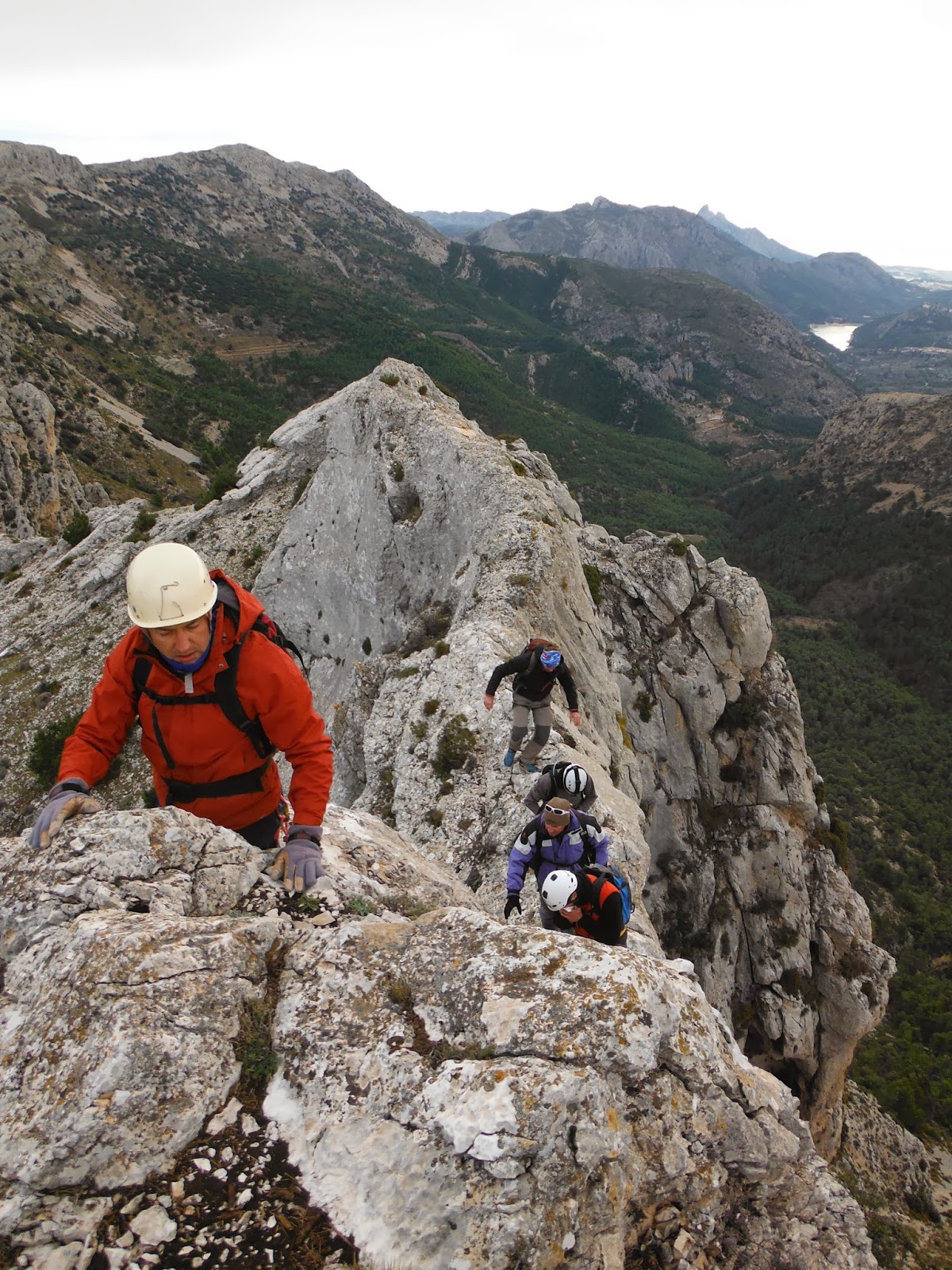 Esta cresta posee dos pasos de IVº y tres IIIº, se puede realizar entera sin cuerda si contamos con cierta experiencia en la realización de estas actividades, aunque es aconsejable llevar una cuerda para aseguramiento de algunos destrepes que resultan un poco aéreos. Nosotros la realizamos usando cuerda doble, ya que ninguno la habíamos realizado. Otro factor que influyó para el uso de la cuerda, fue la inexperiencia en escalada de Alberto y la poca mía, si bien yo si he realizado varias crestas, escalada y poseo mucha experiencia en Montaña, barrancos y Espeleología, era mejor asegurarse, al fin y al cabo íbamos a disfrutar y a pasarlo bien. El amigo Pels, experimentado escalador, así lo consideró y nosotros le hicimos caso.