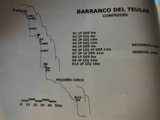 Es un barranco seco, muy bonito que encadena varios rapeles, en un principio abiertos y que poco a poco se va encajonando. Ya casi al final tiene un rapel de 27 metros de los cuales, unos 15 son volados. Una vez pasado este rapel, podemos esquivar los tres restantes justo en el punto donde se debería de montar el siguiente, abandonando por el lado derecho.